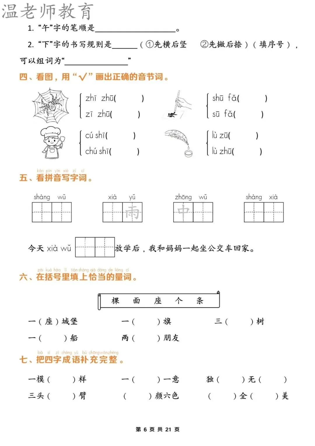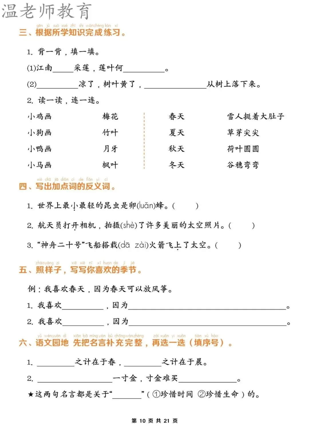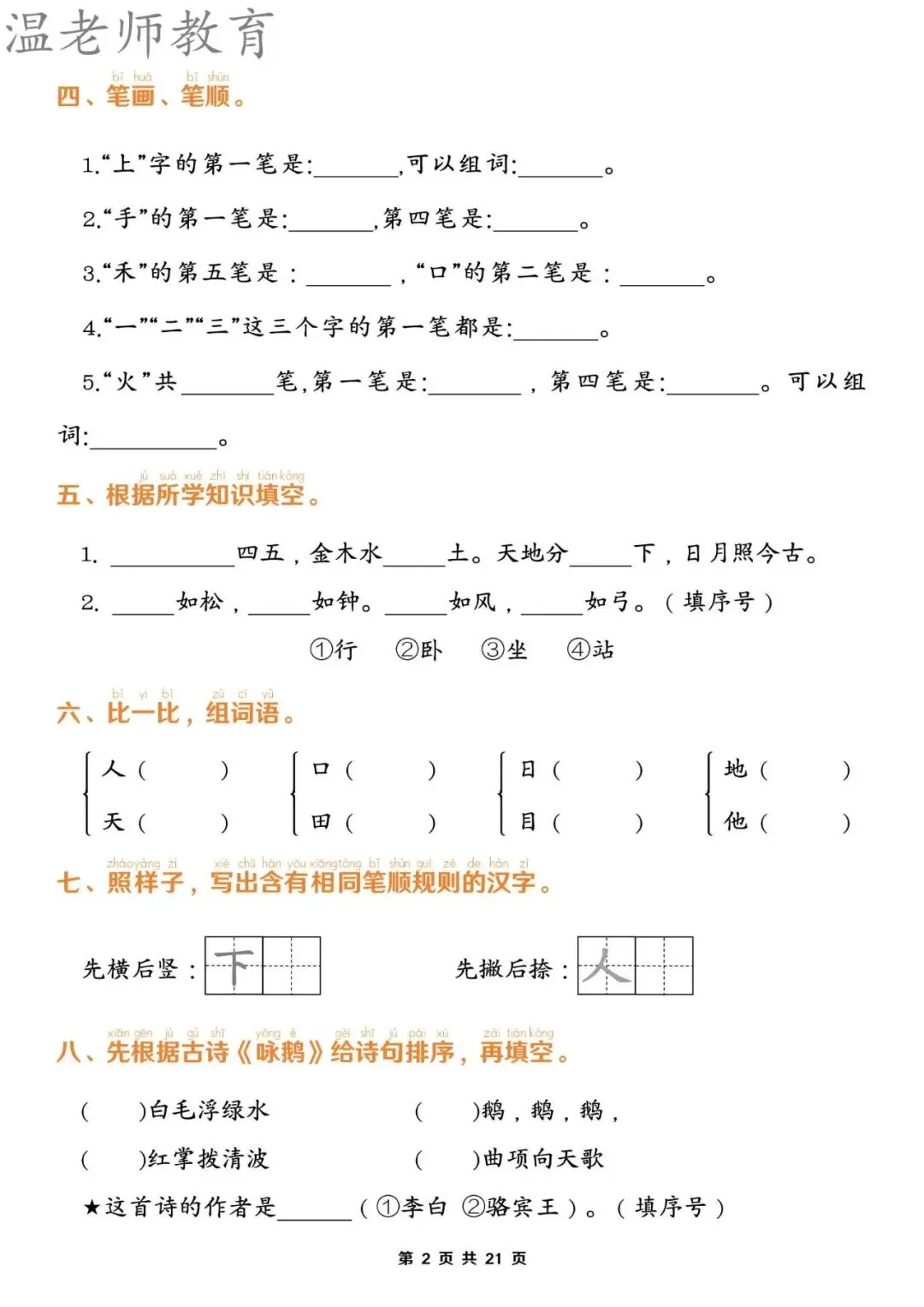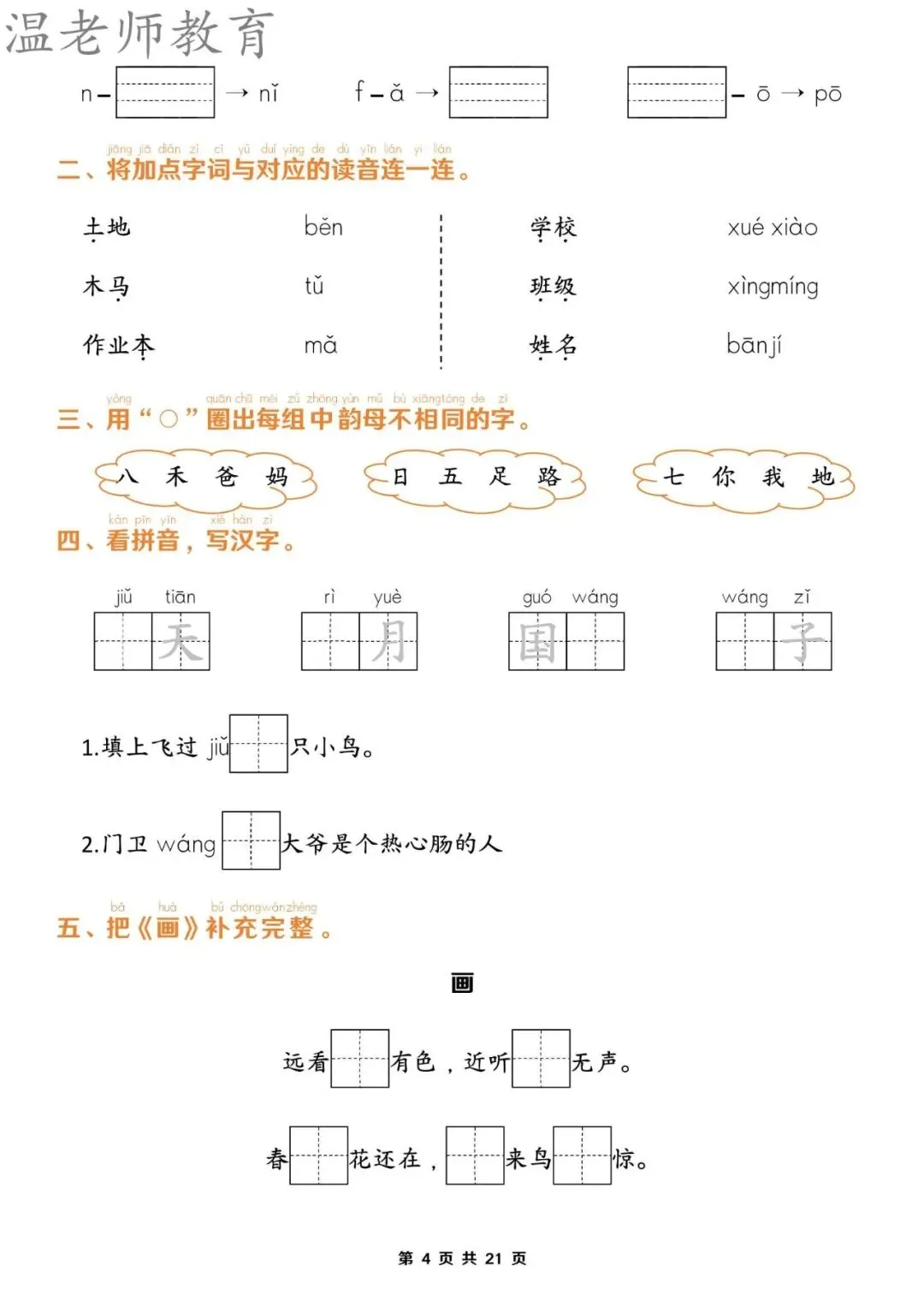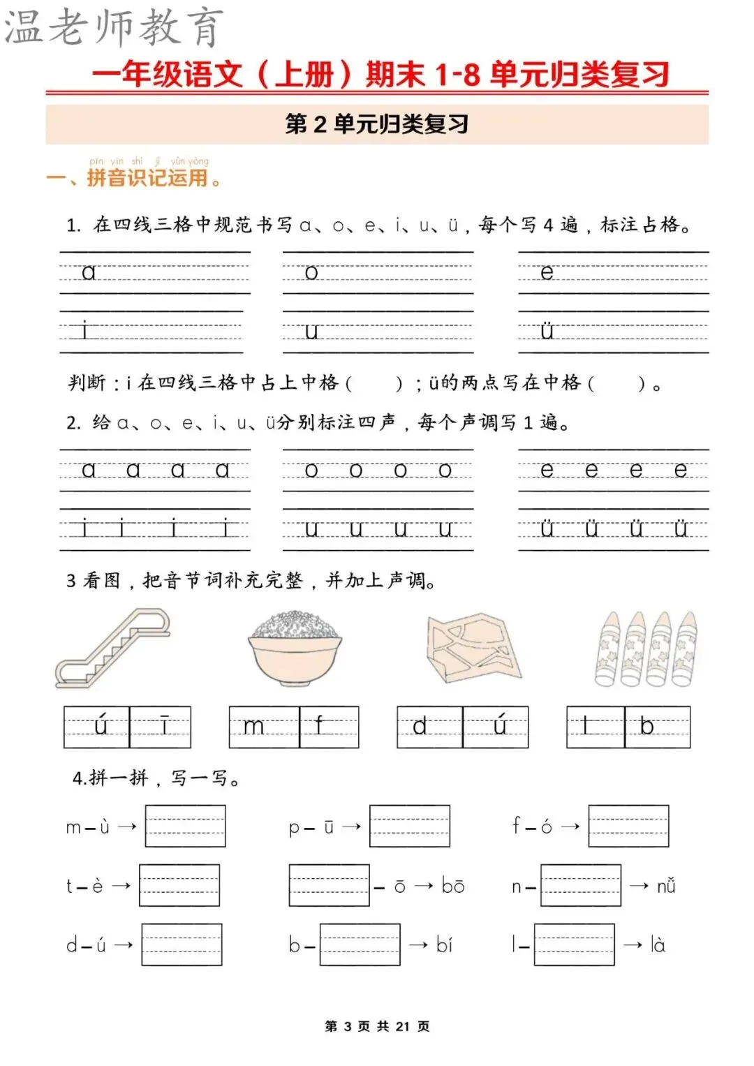 【资料整理】一年级上册语文期末1-8单元归类复习(含答案21页)