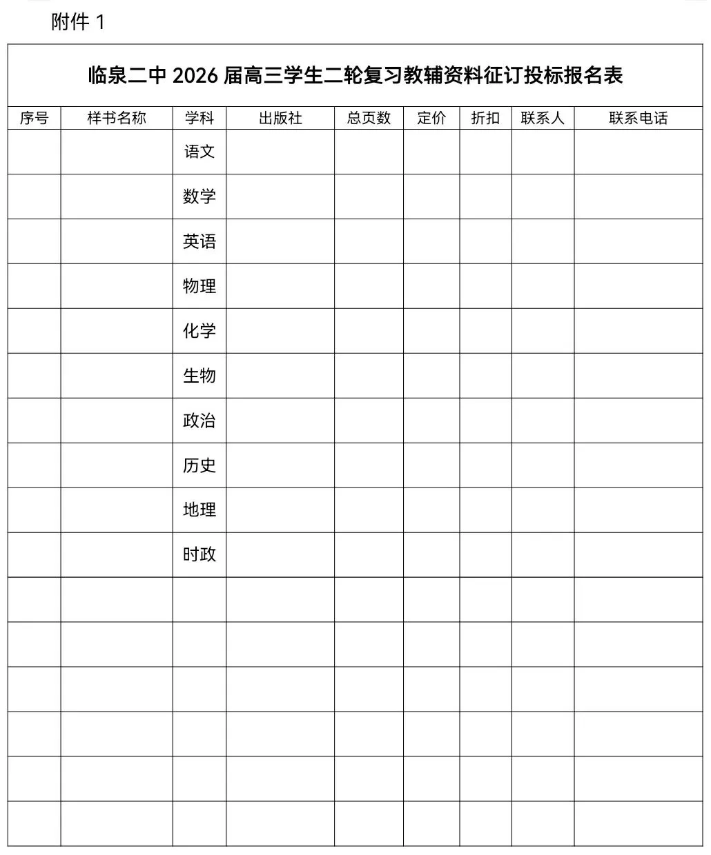 根据国家及省市教育主管部门对中小学教辅资料选用的有关要求,经学校党委会研究决定,对2026届高三学生二轮复习教辅资料征订进行公开招标。