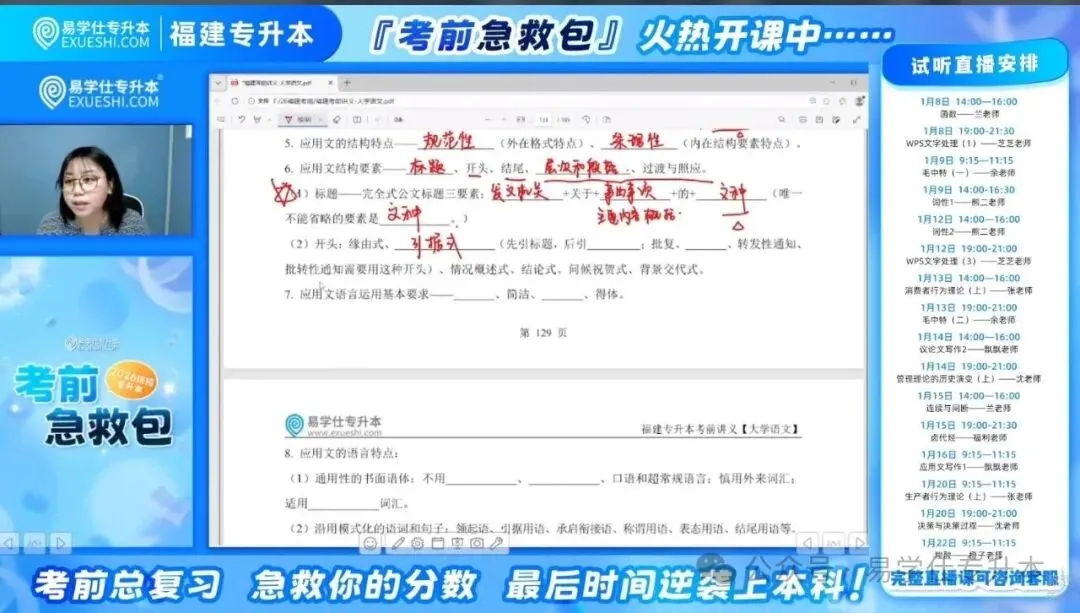 易学仕的考前直播课一定要去跟,听完后花半个小时整理笔记,这个课上老师会归纳很多重点,相当于带你复盘一遍之前学的内容。