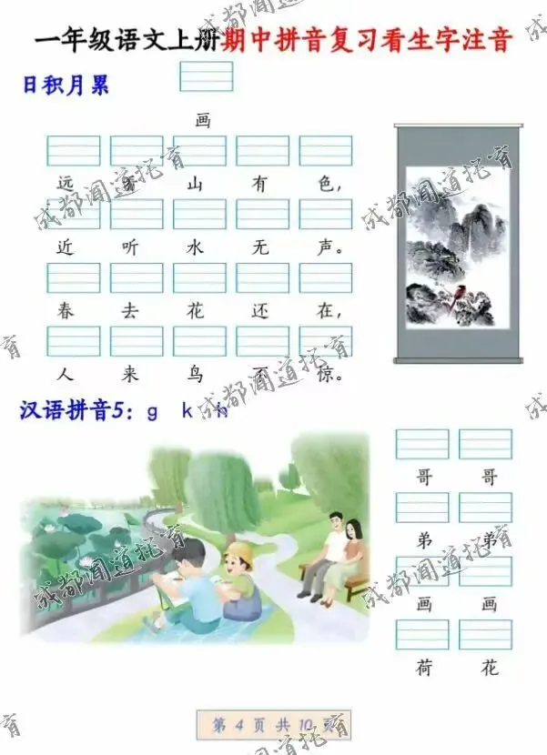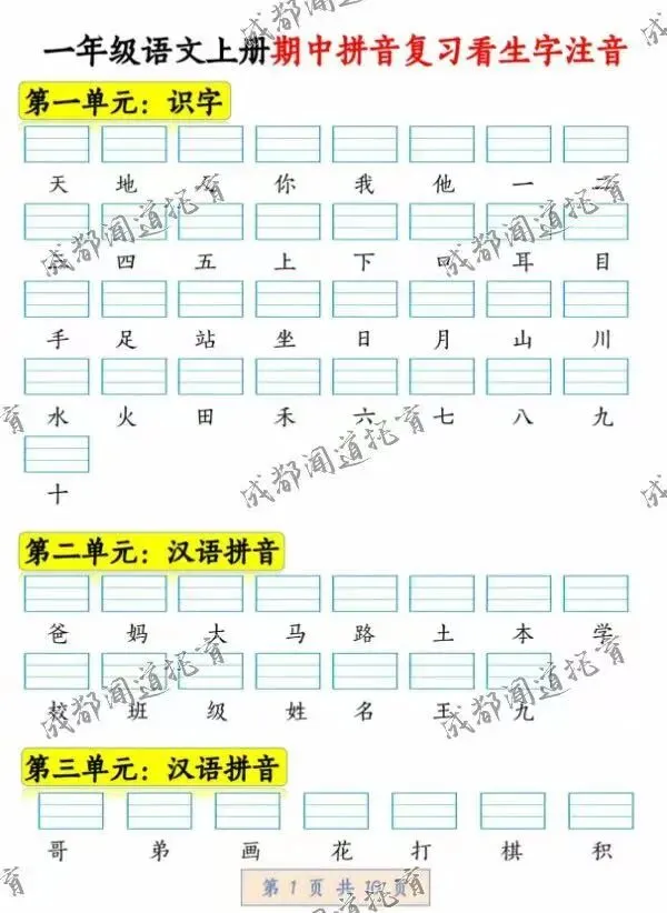 即可免费领取《一年级语文上册期中拼音复习 看生字注音》