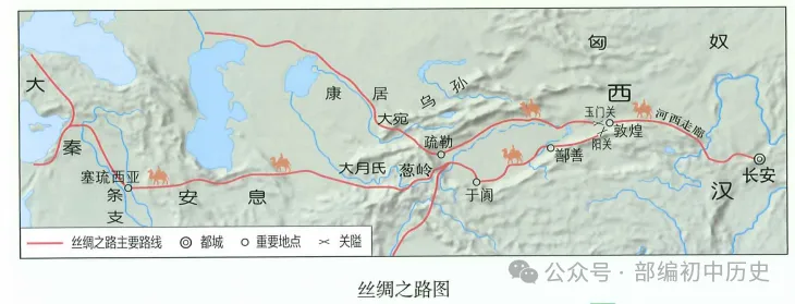 (6)主要路线(从东到西):长安→河西走廊→西域(今新疆地区)→中亚、西亚→欧洲(大秦)。