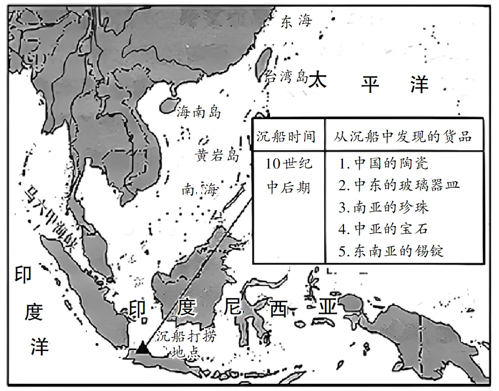 【解析】由沉船打捞地点是在印度洋附近,其中发现的货品来自中国、中东、南亚、中亚和东南亚这些信息可以得出,当时印度洋的贸易往来比较活跃,故选C项;世界市场基本形成是在工业革命后,与沉船时间10世纪中后期不符,排除A项;海上丝绸之路开辟于汉武帝之后,与沉船时间10世纪中后期不符,排除B项;欧洲早期殖民扩张开始于15世纪末16世纪初,排除D项。