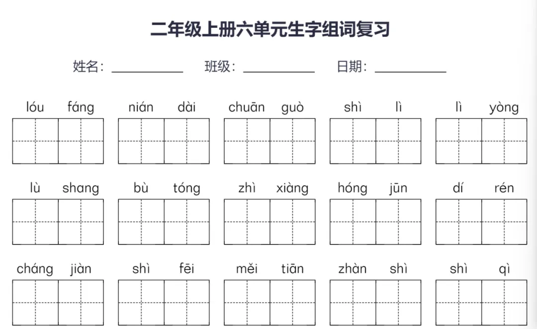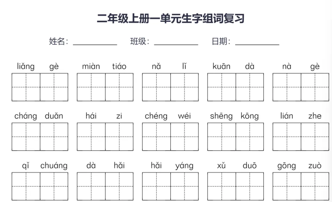 二年级上册要求会写的生字一共有250个,这里将每个单元的课文和园地的生字合在一起,进行看拼音写词语的练习,所选的词语涉及的生字均为二年级孩子已经学过的生字。PDF文件共16页,包含8页看拼音写词语+8页参考答案,原文件无水印,可直接打印。