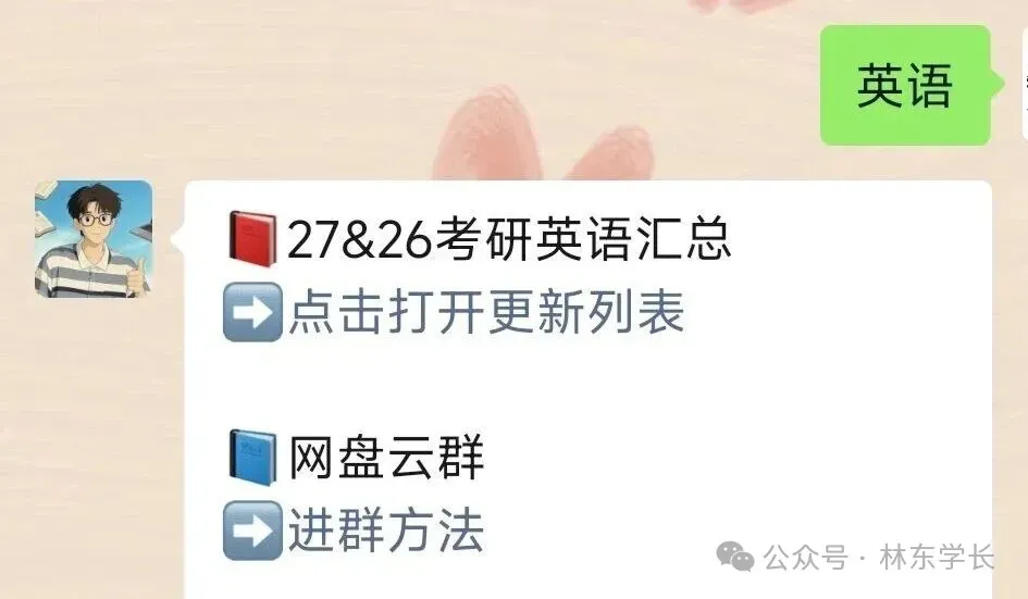 公众号【林东学长】后台回复:英语、数学、政治、管综、西综、专业课、电子版、笔记、复试...等关键词,后台会发送课程链接提取即可!