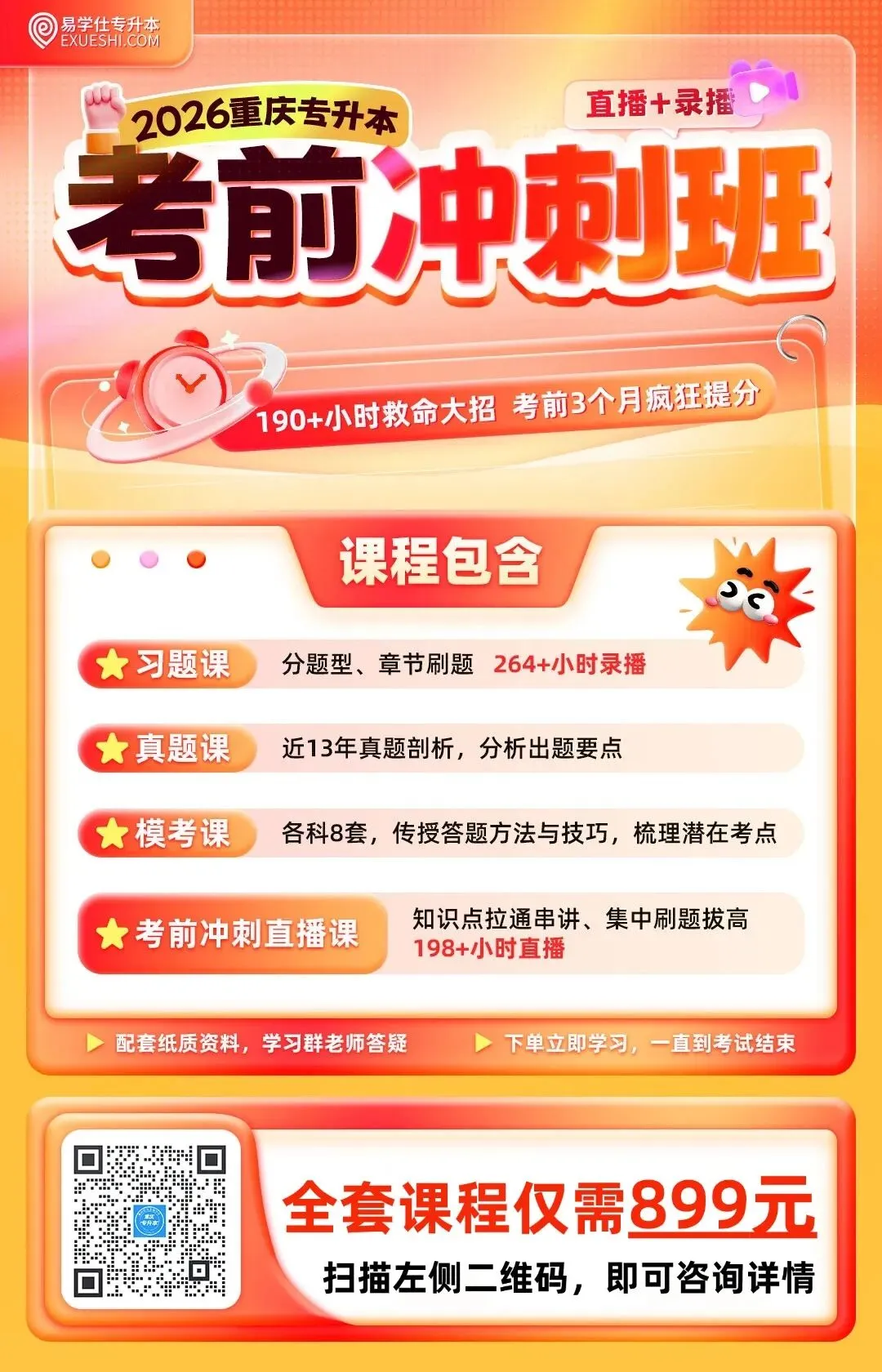 【考前冲刺班】是咱们易学仕最后一轮考前直播课。本轮课程会将各科知识点拉通串讲,充分利用考前几十天带领大家快速掌握核心考点。