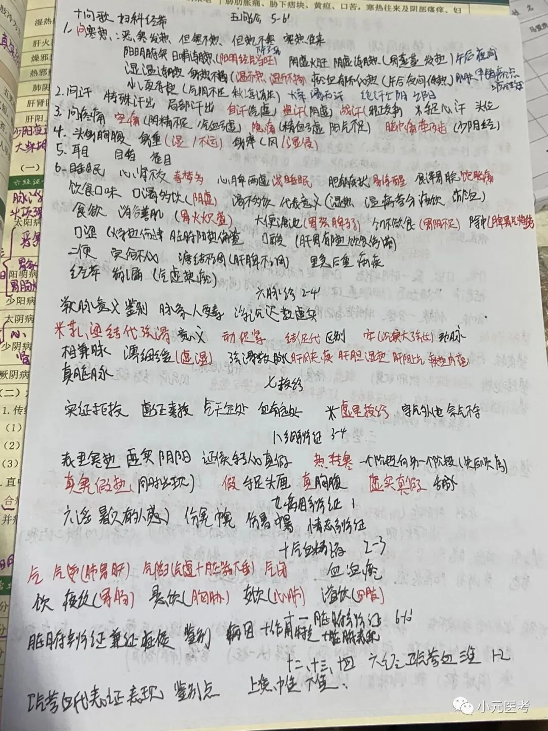 望诊、望舌、闻诊、问诊、脉诊、八纲辨证、气血津液辨证、脏腑辨证为易考点,这一部分的舌脉歌诀要记住,八纲辨证为难点,视频推荐李烁。舌脉歌诀参考以下文章,笔记可参考下图我自己复习时所写笔记。