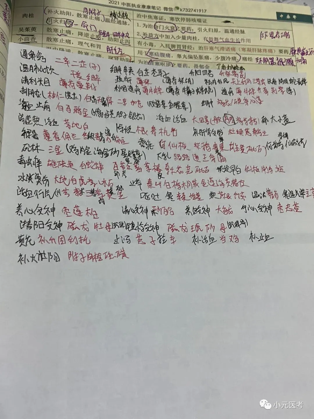 汗清泻下续三湿,温气食虫止活血,化痰安神平息风,窍虚收涩攻拔毒。除此外总论的性能、配伍、用药禁忌也会考到。中药我没用快快记,我用的分组记忆法,先把每个章节的每个小组的药背到,然后主要背他们不一样的功效。视频推荐刘达和李烁。刘达老师的视频课,我看了不下5遍,第一次让我觉得中药记起来可以这么简单,她所采取的就是分组记忆,她也会趣味记忆,帮你背到每个小组包含的药,应对考试没问题。烁哥的视频中药也讲的细,烁哥也做了独家总结。刘达视频课少,李烁视频课多。大家结合自己时间决定。笔记可参考下图我自己复习时所写笔记。