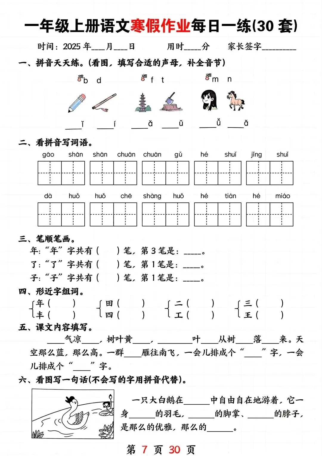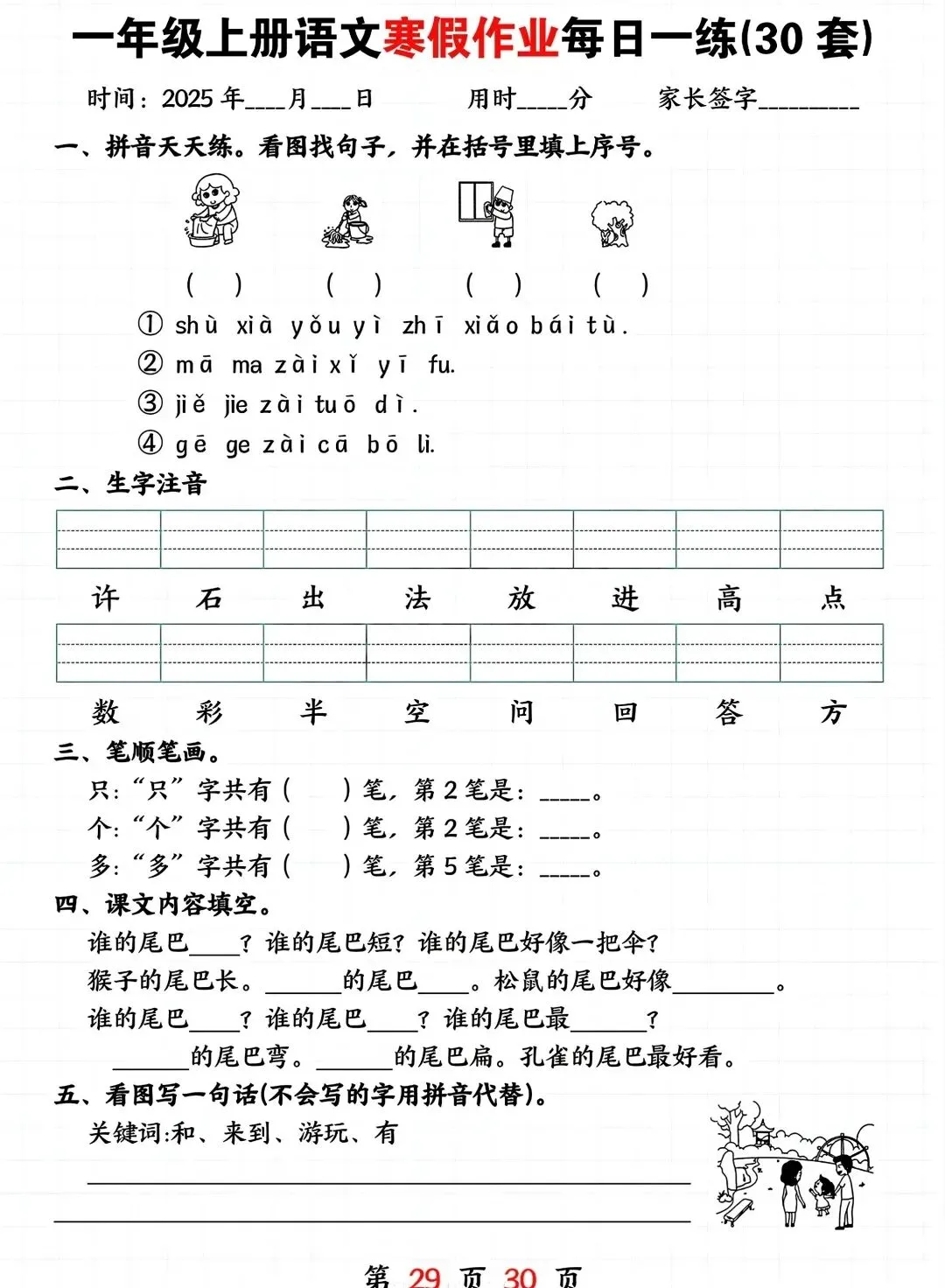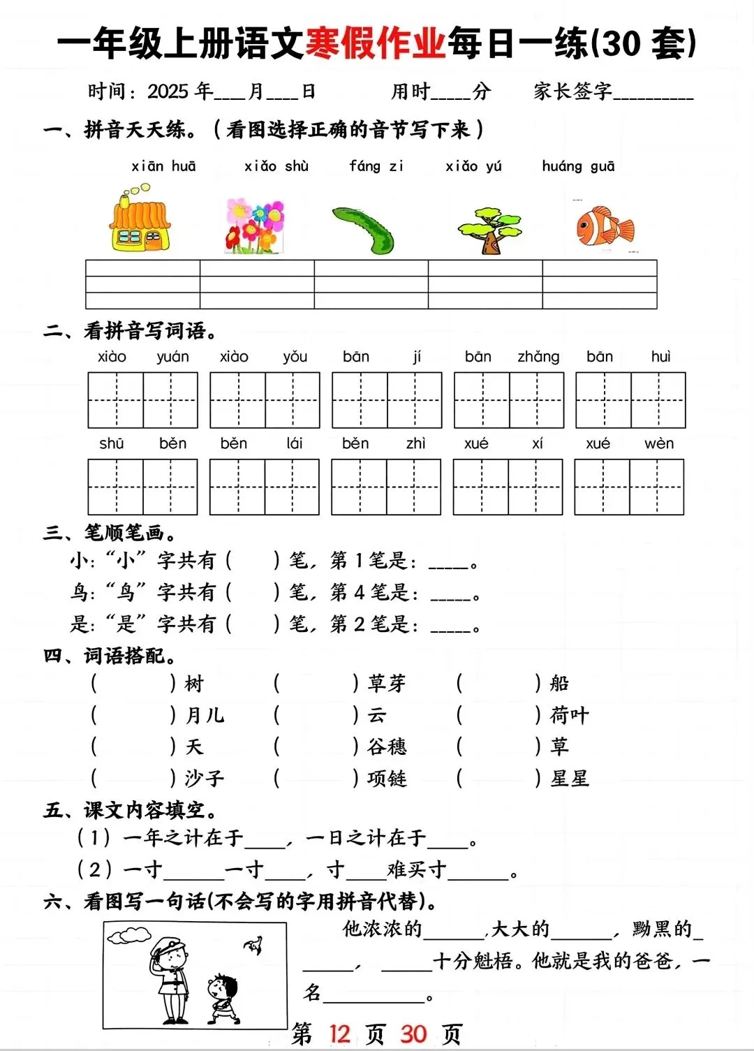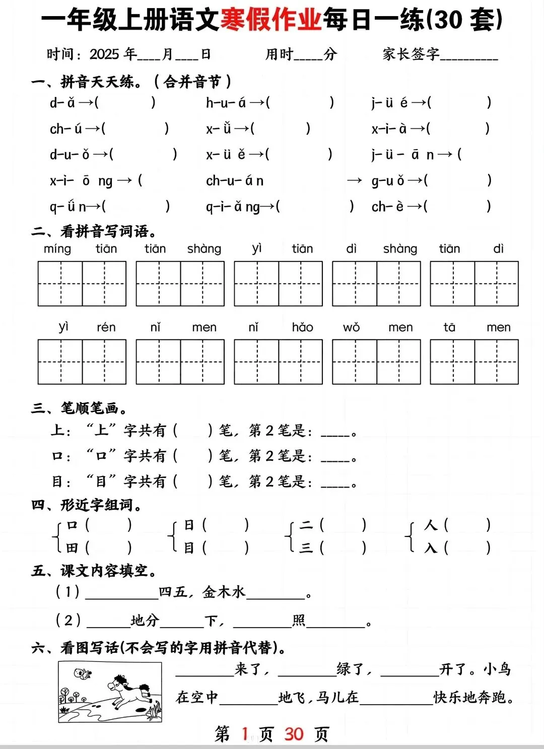 一年级寒假复习预习资料,电子版可打印有答案,需要的家长可以打印出来让孩子练一练!~