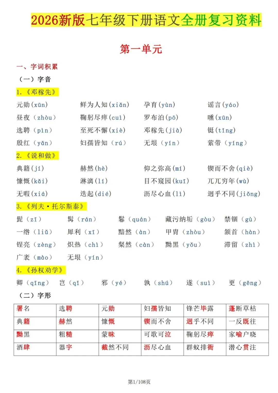 2026年春最新七年级下册语文全册复习资料108页(文末有完整电子版,可打印,建议收藏)!