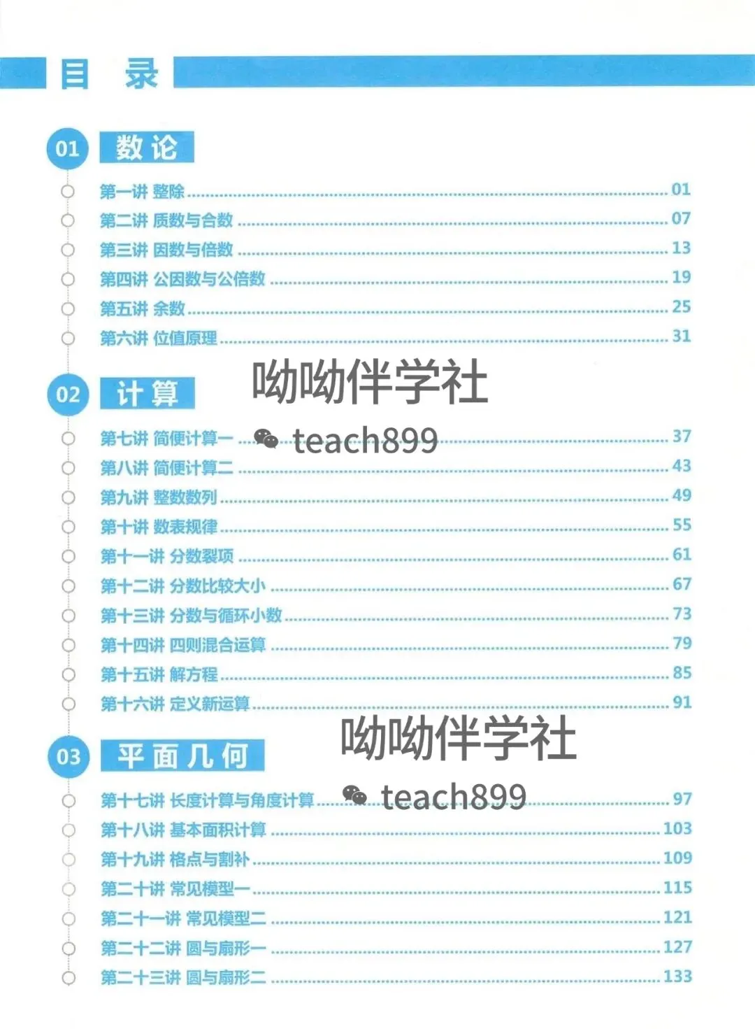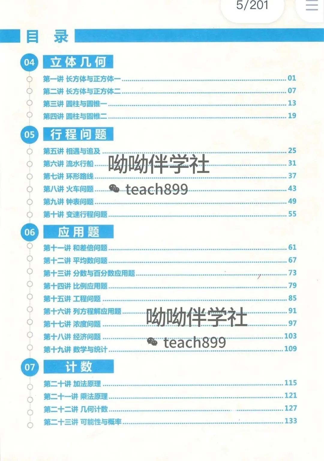 教材内容涵盖数论、计算、平面几何、立体几何、应用题、行程问题和计数七大专题。