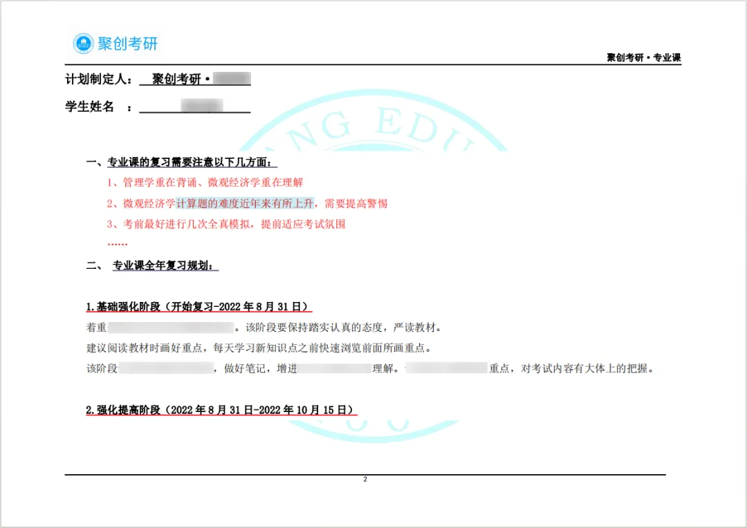 ⭕聚创考研专业课一对一辅导计划制定全程专业课精细化复习规划,贴心地为你准备专业课全年复习规划及各个阶段具体学习计划详情表。