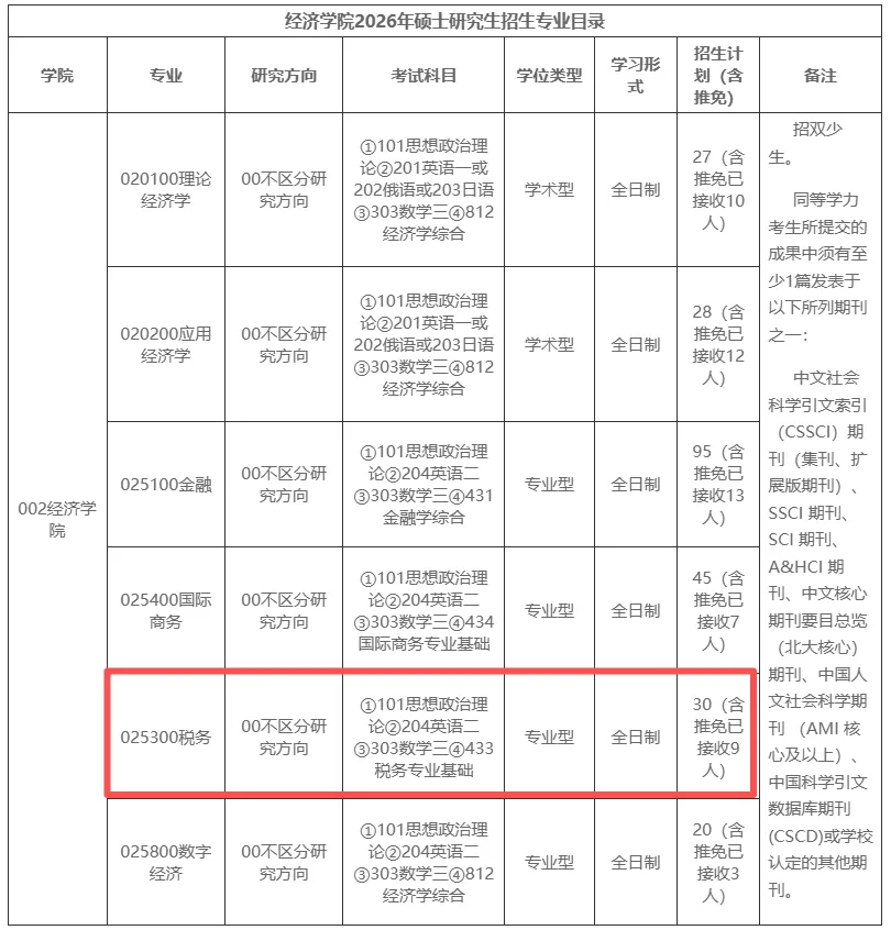 初试科目 | ①101思想政治理论 ②204英语(二) ③303数学三 ④433税务专业基础 |