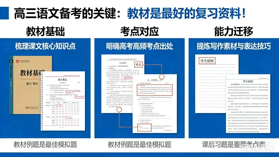 高三语文备考,教材是纲,真题是目,纲举目张。把教材嚼透、用活,既能守住基础分,又能突破阅读、作文的高分瓶颈,是性价比最高、最稳妥的备考路径。