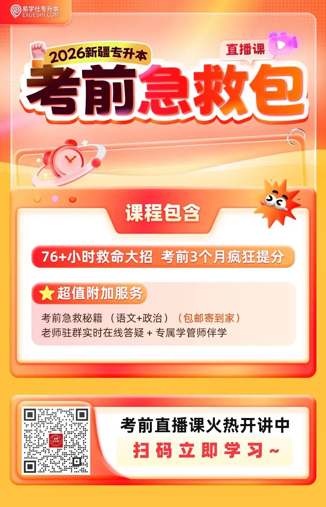 现在知识点学习上还存在疑问和遗漏的,可以看看【考前急救直播课】,这个课程是串讲专升本考试的重要考点,梳理知识体系,传授各种题型的解题技巧和方法,用考前几十天,把所有核心知识点都吃透。