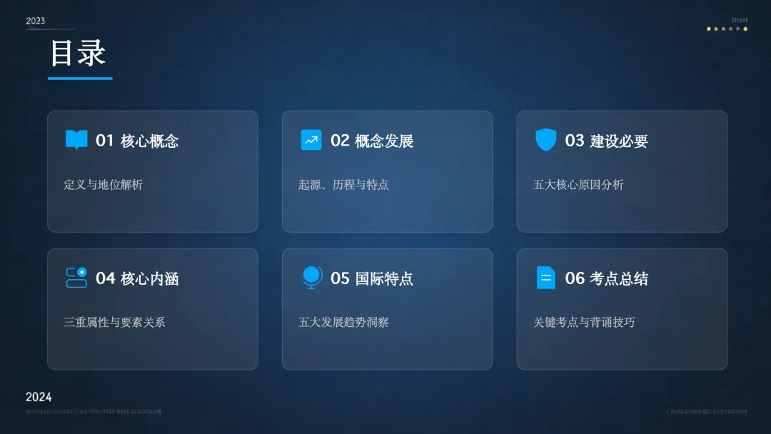 根据文档内容,我们可以将关键考点归纳为五大类:定义类、发展类、必要性类、内涵类和国际特点类。大家在复习时,可以按照这个分类,逐一攻克每个类别的知识点。