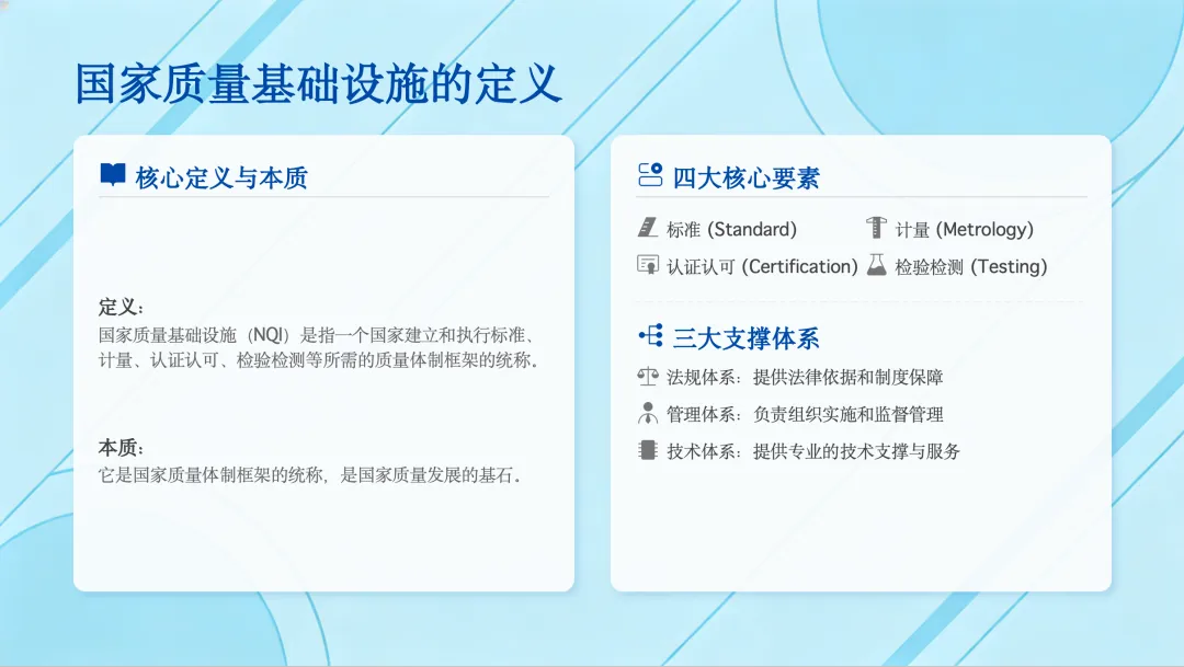 首先来看NQI的定义。简单来说,它是一个国家质量体制框架的统称,支撑着标准、计量、认证认可、检验检测这四大核心要素的建立和执行。这个框架具体包含了法规、管理和技术三大体系。大家需要重点记忆这四个核心要素和三个体系。