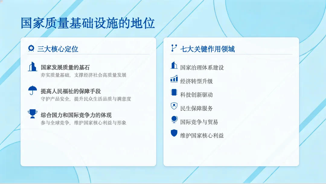 了解了定义,我们再来看看NQI的地位。它的地位可以用三个定位来概括:它是国家发展质量的基石,是提高人民福祉的保障,也是国家综合国力和国际竞争力的体现。具体来说,它在国家治理、经济转型、科技创新、民生保障等七大领域都发挥着至关重要的作用。