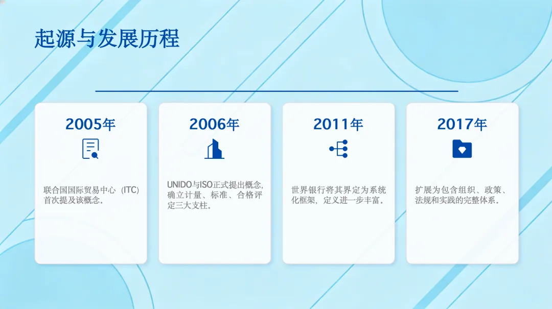 NQI的概念并非一蹴而就。它最早在2005年被提及,2006年由UNIDO和ISO正式提出,并确立了计量、标准、合格评定为三大支柱。之后,世界银行和相关国际组织不断丰富和完善其定义,使其从一个简单的概念发展成为一个包含组织、政策、法规和实践的完整体系。