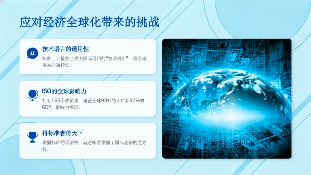 首先,在经济全球化的今天,标准、计量等已经成为国际通用的“技术语言”。拥有165个成员的ISO组织,其影响力覆盖了全球绝大部分的人口和经济总量。因此,掌握标准的话语权,就意味着掌握了国际竞争的主导权,这正是“得标准者得天下”的体现。