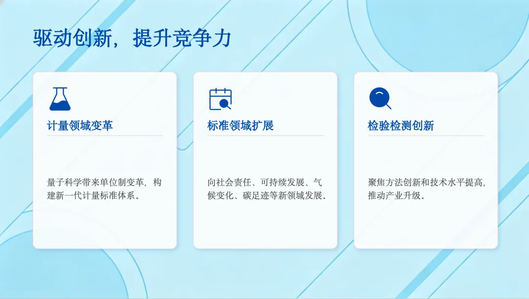 其次,NQI是驱动创新、提升国家竞争力的关键。在计量领域,量子科学正在带来革命性的变革;在标准领域,其覆盖范围正向社会责任、可持续发展等新兴领域扩展;在检验检测领域,方法和技术也在不断创新。这些都将有力地推动产业升级和技术进步。