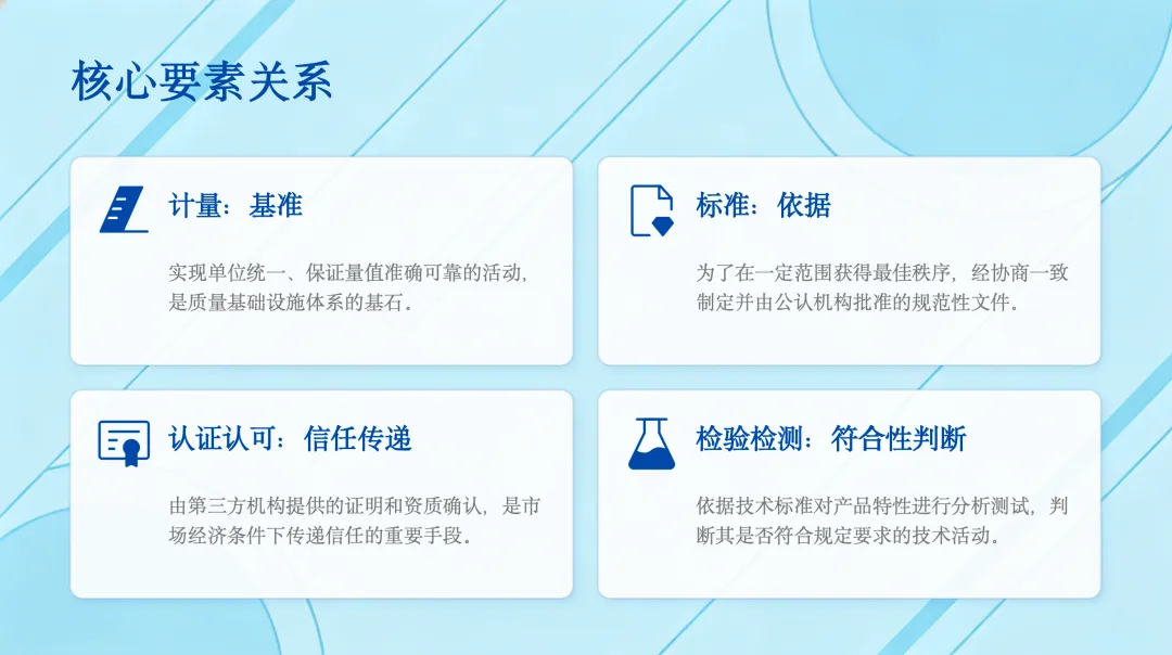 那么,这四大要素之间是什么关系呢?简单来说,计量是整个体系的基准,标准是执行的依据,认证认可是传递信任的手段,而检验检测则是进行符合性判断的工具。它们共同构成了一个完整的质量基础设施体系。