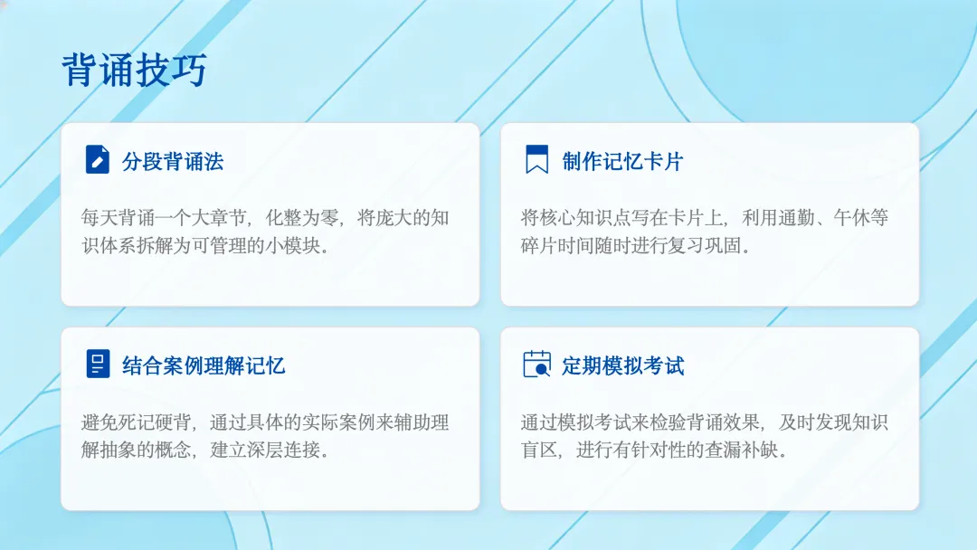 为了帮助大家更好地记忆这些知识点,这里提供几个实用的背诵技巧。比如,可以采用分段背诵法,将大的章节分解开;制作记忆卡片,利用零散时间复习;结合具体案例来理解记忆;以及定期进行自我测试,检验学习成果。希望这些方法能对大家有所帮助。