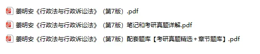 Hi,宝子们好!今天为大家分享的专业课是:姜明安《行政法与行政诉讼法》第7版复习资料:重点笔记知识点总结+题库及答案+考研题目真题解析,适用于考研,复试,硕考,大学期末复习等等,让你在备考时摆脱焦虑,轻松应对考试!【资料的具体目录】截图如下: