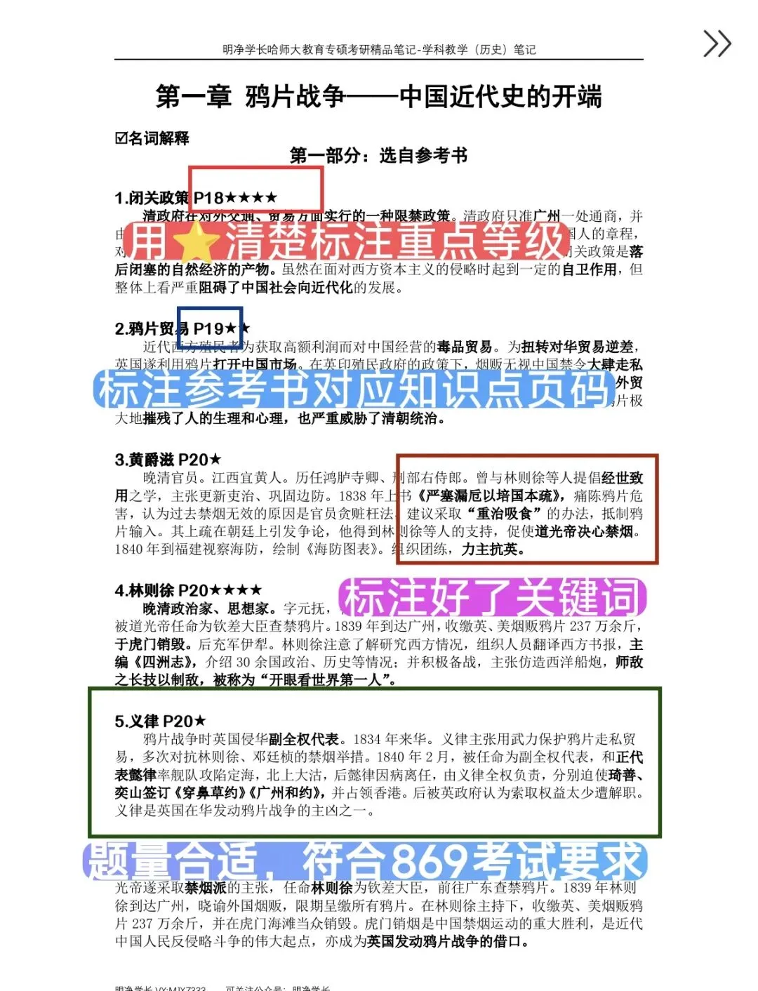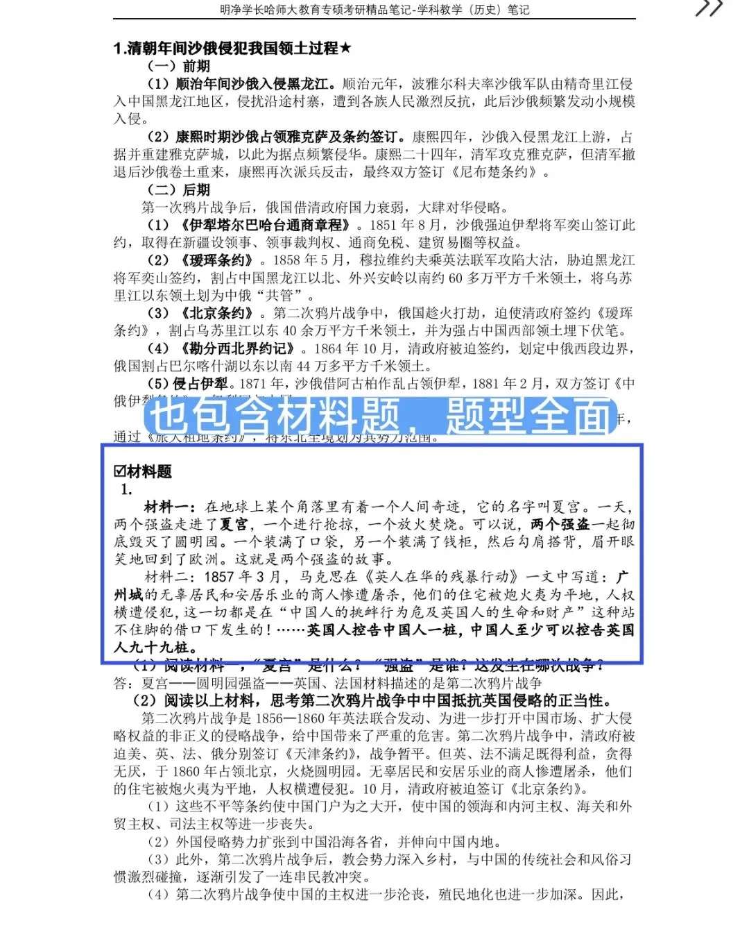 有部分考哈师大学科历史的同学用的是中国近代史的通用笔记,这些笔记质量也很高,但在一些细节上难以符合哈师大的考试特点。如重点是常规考试的重点但不一定是哈师大考试的重点,以及在题目类型、字数数量、题目范围等方面并没有结合哈师大869的考试情况。