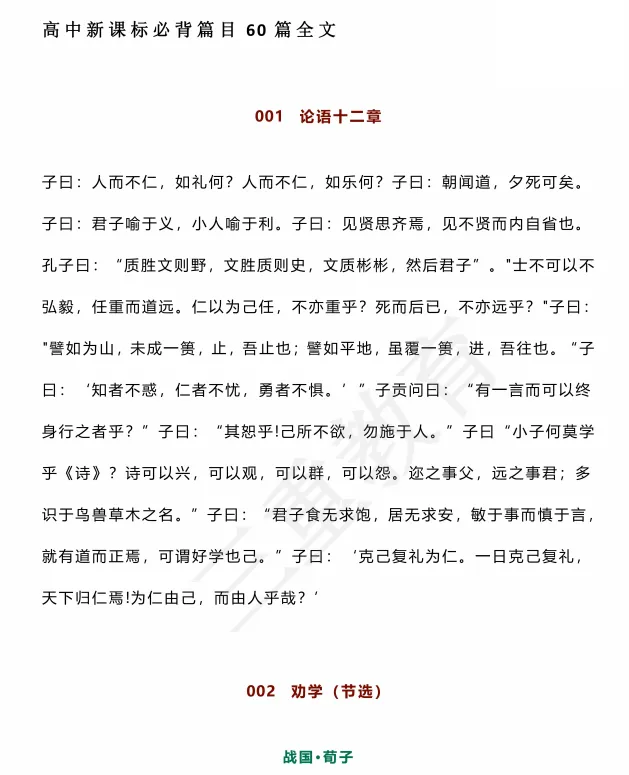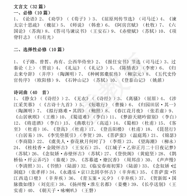此内容源自《普通高中课程标准(2017版)》,也就是新教材版本的内容。包括文言文20篇(必修教材10篇,选择性必修教材10篇),诗词曲40首。要说明一句的是,新高考明确背诵考查范围为必修和选择性必修内容,不包含选修教材内容。《山西2026新高考语文必备60篇》
