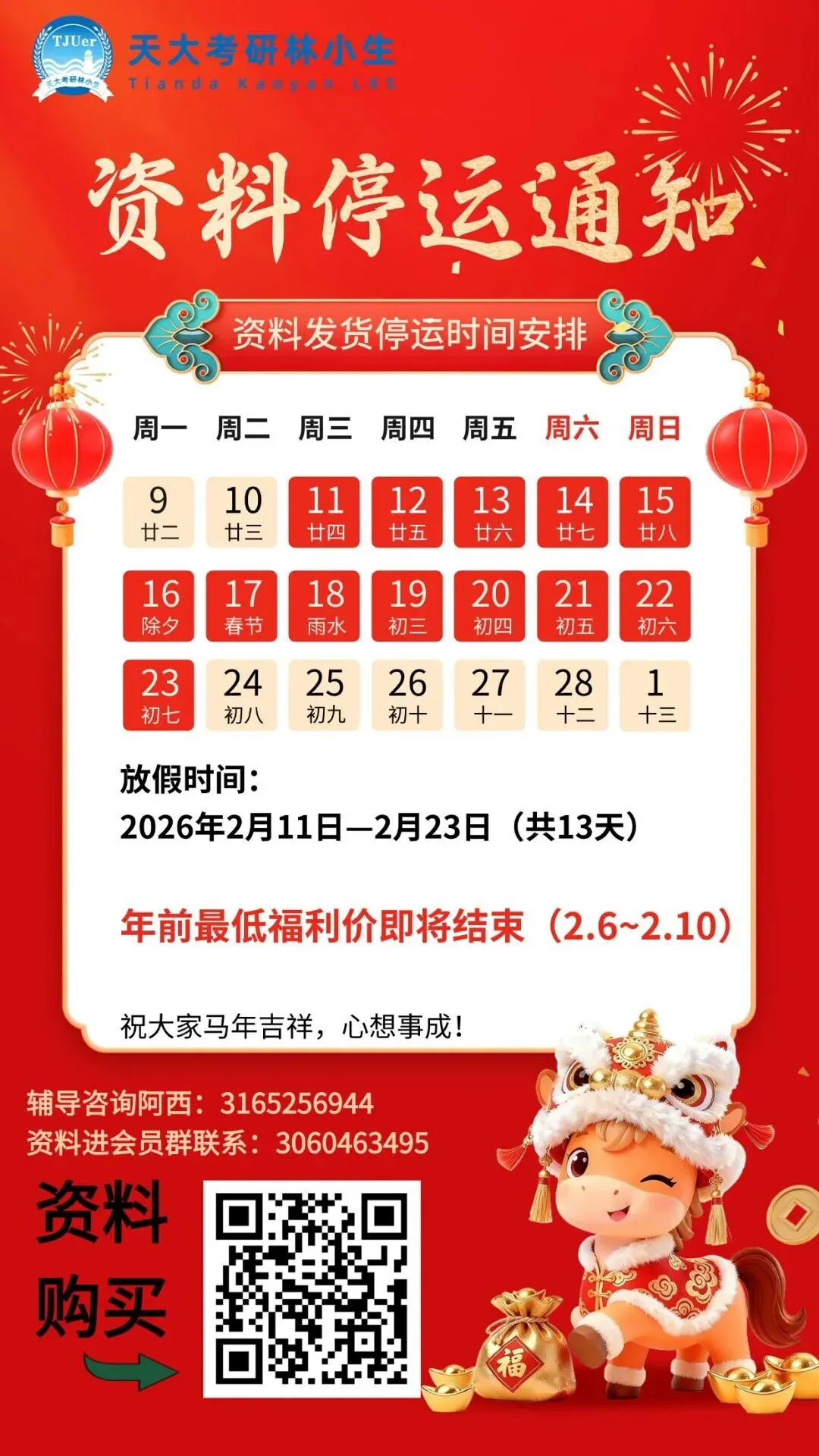 马上快过年了,学长学姐也都放假了,快递公司和打印部也在过年收尾。2026复试资料在2.11日停止发货,恢复时间预计为2月23日,现在下单是可以马上发货的!