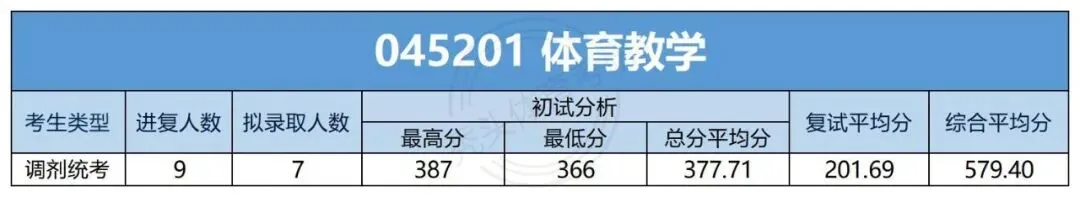 体育硕士体育教学领域一志愿全日制统考复试0人,调剂复试9人,拟录取7人,拟录取率77.78%;拟录取初试最高分387分,最低分306分,拟录取初试总分平均分377.71分。
