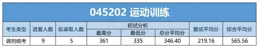 体育硕士运动领域一志愿全日制统考复试0人,调剂复试9人,拟录取5人,拟录取率55.55%;拟录取初试最高分361分,最低分333分,拟录取初试总分平均分346.4分。