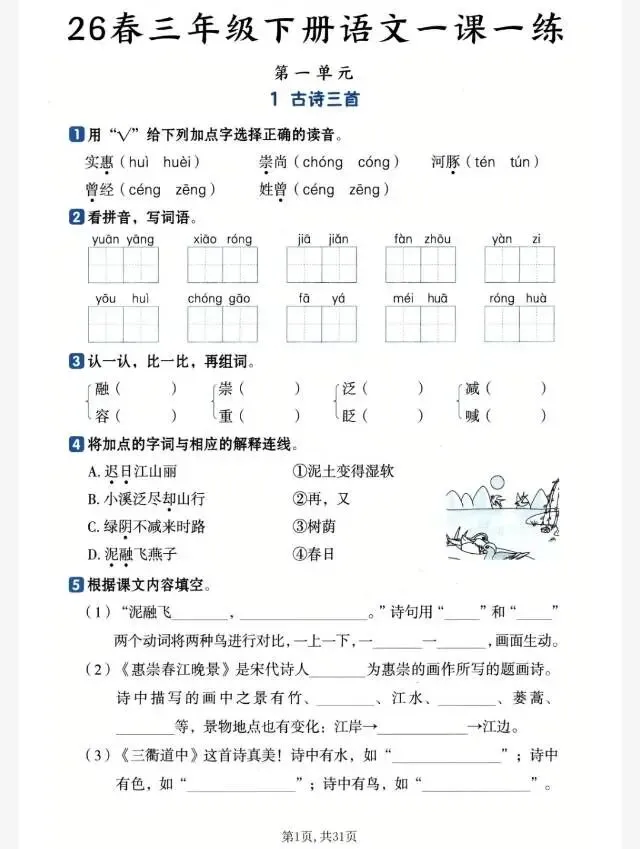 这套1-6年级小学语文预习复习资料大礼包,覆盖全年级上下册核心考点,从生字、词语、古诗到课文、句式、专项练习,一站式搞定课前预习、课后巩固、期中期末冲刺,是孩子语文学习的“全能助手”。- 全年级覆盖:从一年级识字写字,到六年级阅读理解与习作,同步人教版教材,循序渐进。- 内容超全:生字笔顺、多音字辨析、近反义词、词语积累、古诗注释译文、课文批注、句式训练、专项练习、单元重点梳理、字帖练字等,一网打尽。- 学练结合:既有“晨读晚默”“一课一练”等背诵默写资料,也有“教材帮”式详细讲解,彩色标注重点,难点拆解清晰。- 实用高效:可直接打印使用,每天10分钟,轻松夯实语文基础,提升应试能力。- 寒假/暑假预习:提前熟悉下学期内容,开学领跑。- 日常同步学习:课前预习、课后复习,巩固课堂知识。- 期中/期末冲刺:单元重点梳理、专项练习,查漏补缺。- 基础薄弱提升:生字、词语、古诗等专项资料,针对性强化等。
