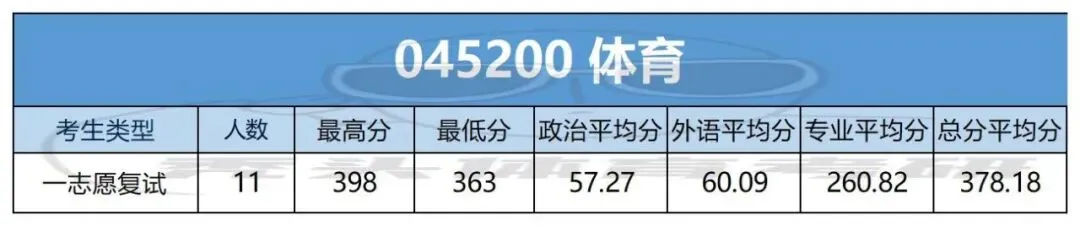 体育硕士一志愿统考11人,初试总分最高分398,最低分363,平均分378.18.