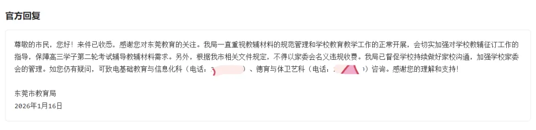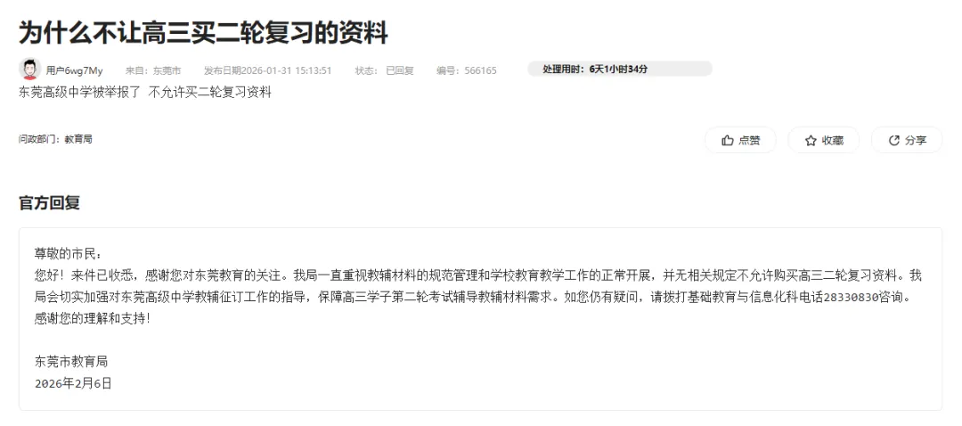 近日,有东莞的网友在问政平台上反映称,东莞某高中由于被举报了,导致高三学生买不了二轮复习资料。针对该情况,东莞市教育局公开回复称:我局一直重视教辅材料的规范管理和学校教育教学工作的正常开展,并无相关规定不允许购买高三二轮复习资料。我局会切实加强对东莞高中教辅征订工作的指导,保障高三学子第二轮考试辅导教辅材料需求。2025年秋季学期以来,我国多地教育主管部门出台了新政,规范教辅进校园,严禁学校或教师推荐课后教辅材料,严禁家委会向学生推荐购买教辅材料,旨在减轻学生及家长的教育负担,整治教辅的“灰色产业链”。该新政的出发点是很好的,实施之初也得到了民众强烈的支持。但是在执行过程中,很多人却发现问题不小,最突出的问题之一,就是无教辅可用,这个投诉就是典型案例。由于学校、教师以及家委会都被禁止推荐购买教辅材料了,很多家长和学生都为没有合适的教辅而苦恼,并且即便有合适的教辅,用起来也很难。实际上,在此之前,就有东莞的高三学生在问政平台上反馈,称由于个别家长举报,学校无法统一订购教辅材料,导致复习资料紧缺,只能靠学校自己出题、自己打印,这不仅抬高了学校的运营成本,学生整理起来也极不方便,要求教育主管部门不要搞“一刀切”,允许学校和教师在大部分学生及家长支持的情况下,统一订购教辅材料。当时东莞市教育局的回应是,会切实加强对学校教辅征订工作的指导,保障高三学子第二轮考试辅导教辅材料需求。但同时强调,不得以家委会名义违规收费。我局已督促学校持续做好家校沟通,加强学校家委会的管理。从目前的情况来看,问题似乎并没有解决,高三学生缺乏适合的复习资料的情况依旧存在。应该说,教育局严格落实“规范教辅进校园”的相关规定是在履行自身职责,但是一些学生及家长的心情也可以理解。优质的复习材料对于复习效果重要性是不言而喻的,优质的复习材料能否快速、及时地出现在学生手上,很可能关系到他们的高考成绩乃至今后的人生命运。当有“合适”的复习资料准备集体订购时,却因为极个别人的举报而化为泡影,心中的不满与愤慨可想而知。这种情况的出现,也反映了教育主管部门在落实“规范教辅进校园”的同时,也要做好配套工作,即提供足够丰富的目录内教辅材料或素材,来满足师生们教学、学习需求,尤其是考试的需求。如果不能从根本上解决广大师生们对优质教辅材料的需求,“规范教辅进校园”就无法得到彻底的落实,只会按下葫芦浮起瓢,类似的矛盾无休无止的出现,甚至耽误部分学生的前途命运。这样的结果,违背了其目的。