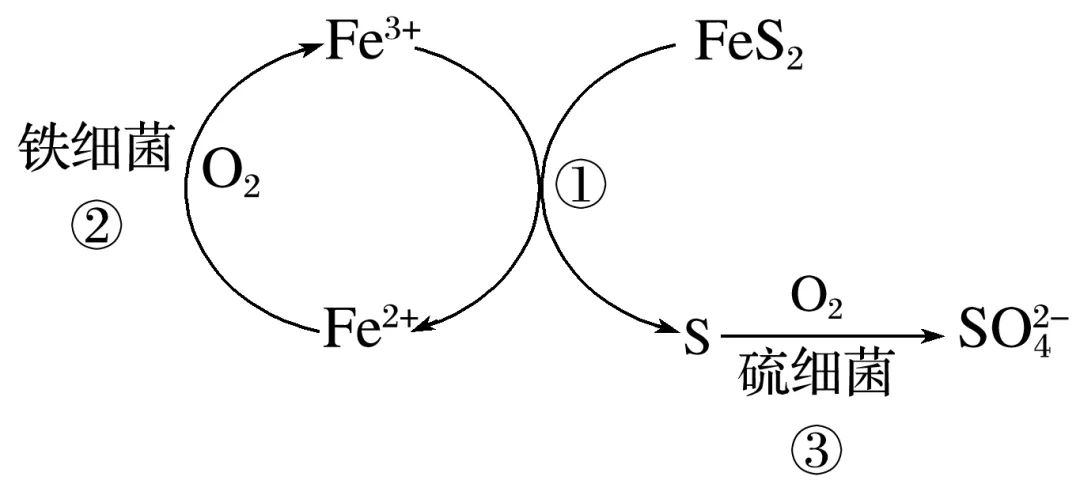 解析硫细菌可以将硫铁矿表面的硫氧化为硫酸根离子从而减少硫铁矿表面的硫,A正确;铁细菌可以将亚铁离子氧化为铁离子,而铁离子可以加快FeS2的溶解,所以铁细菌的存在能提高反应①的速率,B正确;根据流程图可知,FeS2参与反应生成了亚铁离子和硫单质,故废水中铁元素的含量增多,C错误;总反应为4FeS2+15O2+2H2O4Fe3++8S