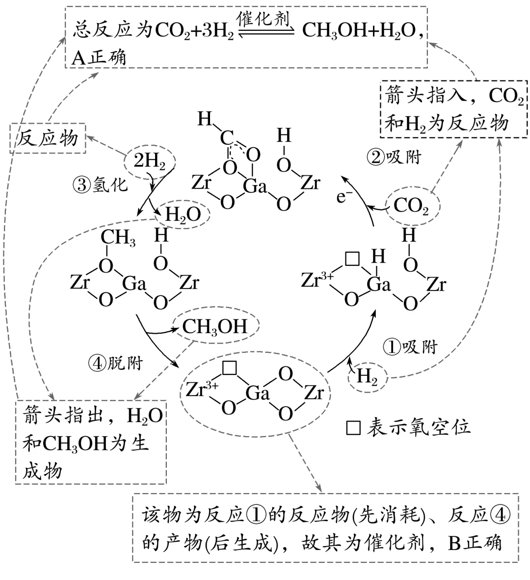 结合已知信息,对比“①吸附、②吸附”加入H2和CO2前后物质的结构变化可知,H2的活化位点是Ga—O,CO2的活化位点是氧空位,故氧空位浓度高,活化位点增多,有利于增强CO2的吸附能力,C错误、D正确。