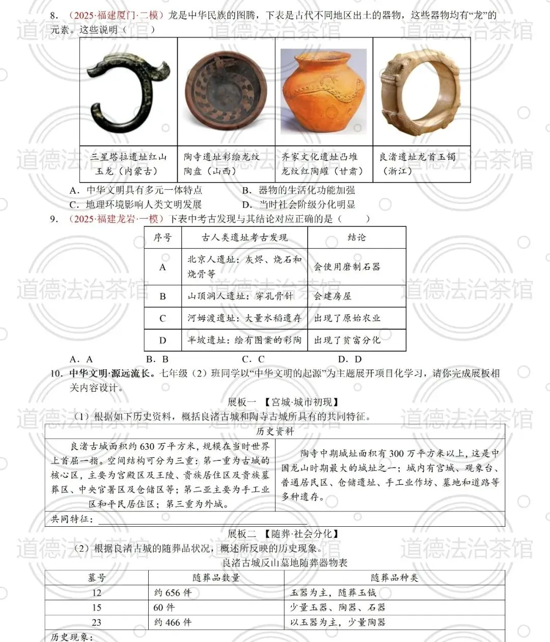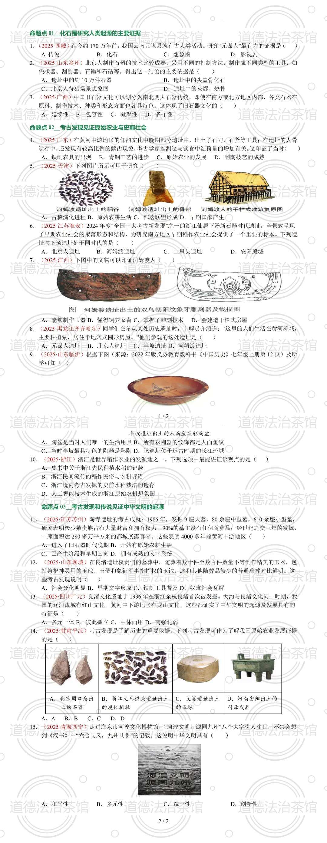 6.(2025.河南)【新考法·以文物鉴赏考查家国情怀】有考古学家认为,下图中分别用不同线条装饰的两侧陶壶,可能代表了两个缔结同盟的部落。从这一视角看,双连壶独特的设计可能体现了先民对()