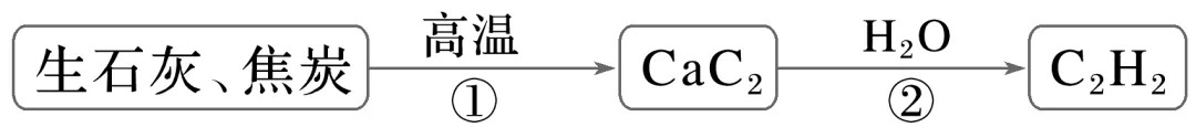 molCaC2中含有的离子数为2NA,B正确;反应②的化学方程式为CaC2+2H2O—→CH≡CH↑+Ca(OH)2,每生成1molC2H2,消耗的H2O分子数为2NA,C正确;C2H2结构简式为CH≡CH,1个碳碳三键中有2个π键,标准状况下,11.2LC2H2(即0.5mol)中含有π键数为NA,D正确。