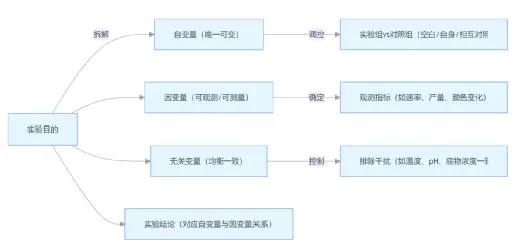 第一步 | 写目的→ 明确 “探究 / 验证 ××(自变量)对 ××(因变量,代谢过程)的影响”(如 “探究光照强度对植物净光合速率的影响”) |