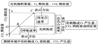 净光合速率 | 光合作用与呼吸作用的差值(有机物积累速率) | CO₂吸收量、O₂释放量、有机物的积累量 | 净光合速率=总光合速率-呼吸速率 |