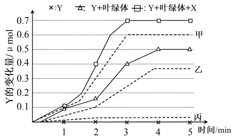 ①用离体叶绿体X和Y(可与NADPH发生反应的化合物)进行实验,在相同光照条件下,实时测定并计算Y的变化量。由图可知,X能(填“促进”或“抑制”)叶绿体合成NADPH。为保证本实验的严谨性,需增设1个处理,即Y+经煮沸的叶绿体。该处理获得的结果最符合图中曲线的(填“甲”或“乙”或“丙”)。