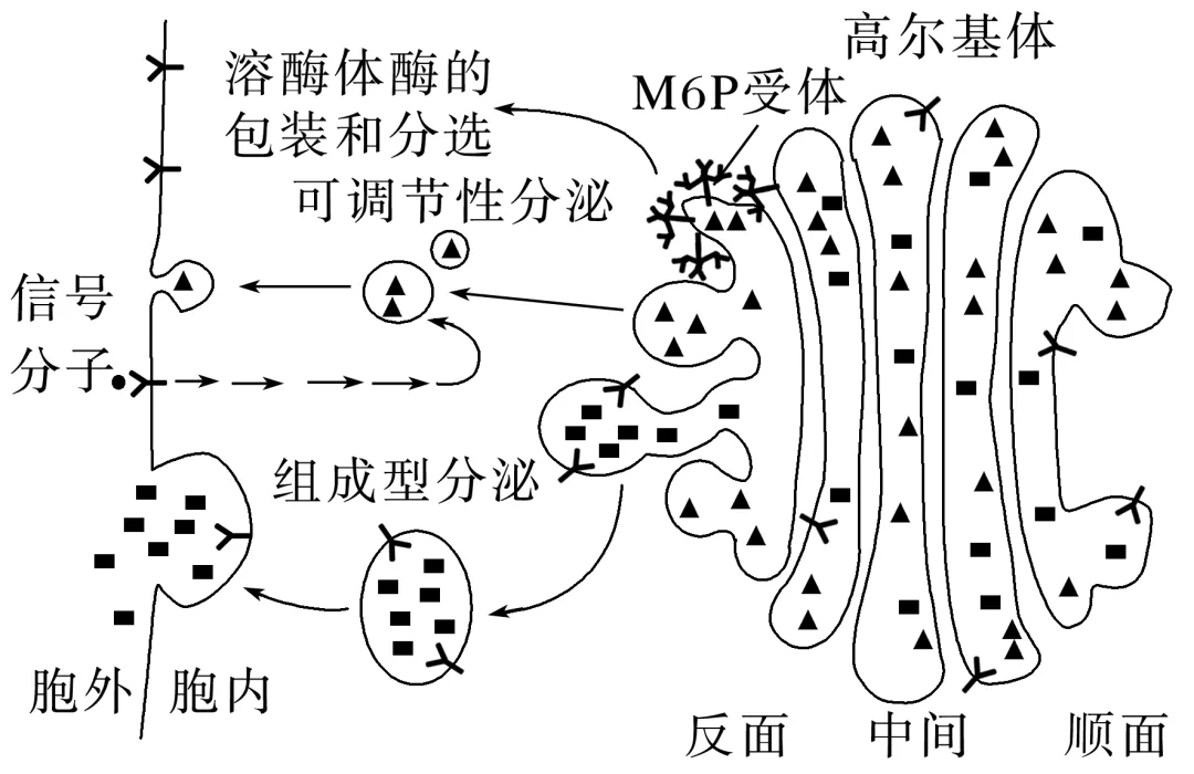 C | M6P受体的分选功能 | 高尔基体反面膜上存在M6P受体(关键结构),这一特异性结构确保了带有M6P标记的溶酶体酶能被准确“分拣”和包装,从而保证溶酶体正常行使降解功能。受体结构异常直接导致功能丧失。 |