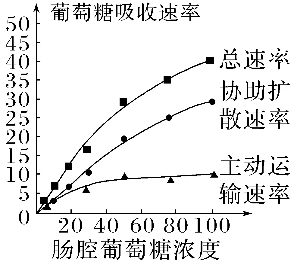 解析 葡萄糖分子较大,不能直接通过磷脂双分子层,需要借助转运蛋白,A正确;肠腔葡萄糖浓度为100时,主动运输速率不再增加,但不能确定葡萄糖吸收速率是否达到饱和,B错误;据图可知,肠腔葡萄糖浓度较高时,协助扩散速率大于主动运输速率,进食后小鼠小肠上皮细胞可能主要通过协助扩散吸收葡萄糖,C正确;小肠上皮细胞对葡萄糖的主动运输可充分吸收葡萄糖,减少了食物中葡萄糖的浪费,D正确。