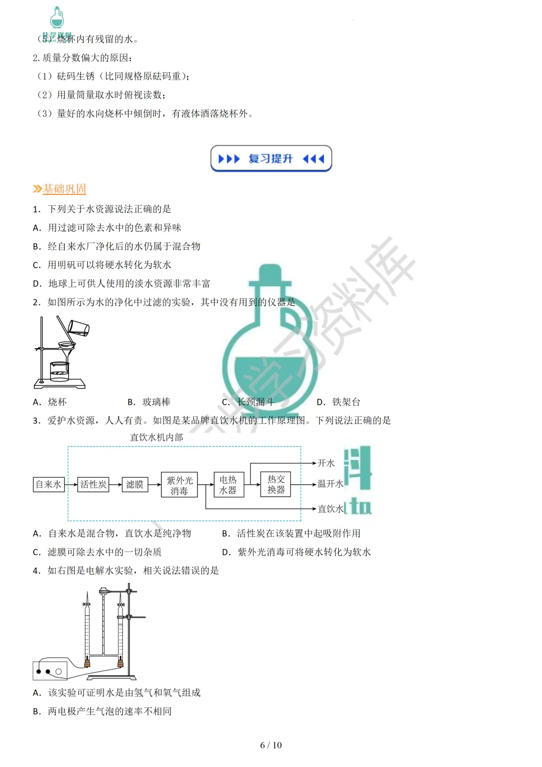 2.了解自来水厂的净水过程;知道常用的净水方法;