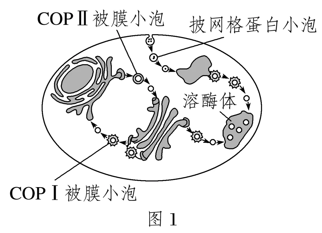 细胞内部产生的蛋白质被包裹于膜泡形成囊泡,囊泡被分成披网格蛋白小泡、COP Ⅰ被膜小泡以及COP Ⅱ被膜小泡三种类型。三种囊泡介导不同途径的运输(如图1所示),其中COP Ⅰ被膜小泡以及COP Ⅱ被膜小泡的识别和运输过程如图2所示。