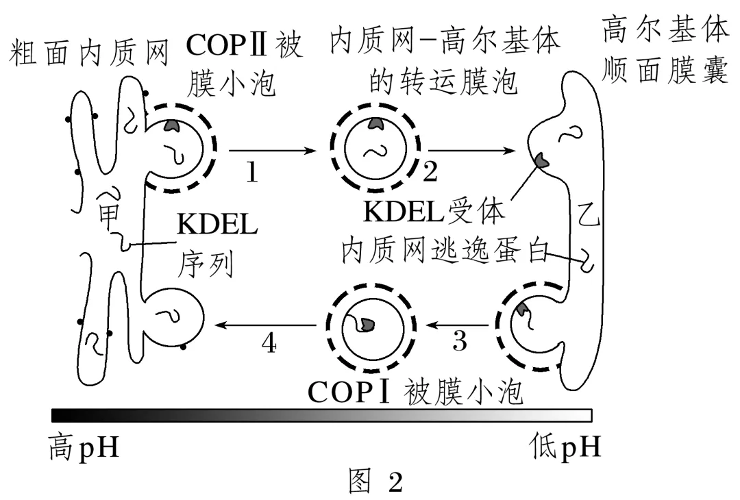 2.(2021·山东,1)高尔基体膜上的RS受体特异性识别并结合含有短肽序列RS的蛋白质,以出芽的形式形成囊泡,通过囊泡运输的方式将错误转运到高尔基体的该类蛋白运回内质网并释放。RS受体与RS的结合能力随pH升高而减弱。下列说法错误的是( )