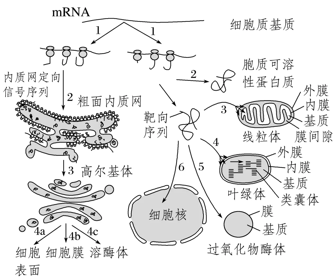 途径3、4、5:表示依据不同的细胞器特异性的靶向序列,首先释放到细胞质基质,然后通过跨膜运输方式转运至线粒体、叶绿体和过氧化物酶体。