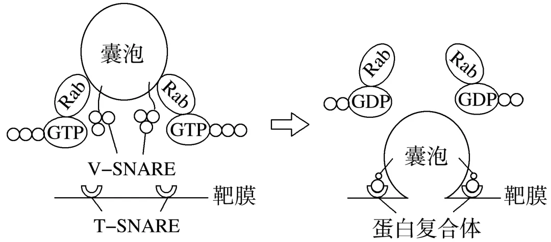 2.(2025·黑龙江名校协作体一模)囊泡运输是真核细胞的内部结构之间运输蛋白质的重要方式,每一种运输囊泡中特殊的V-SNARE标志需与靶膜上的T-SNARE蛋白相互接触到对应位点,囊泡和靶膜才会进行融合。在不同的囊泡转运过程中行使功能的Rab蛋白超过30种,它们能够结合GTP并将GTP水解,帮助囊泡与靶膜结合。囊泡运输的部分过程如图。下列叙述错误的是( )