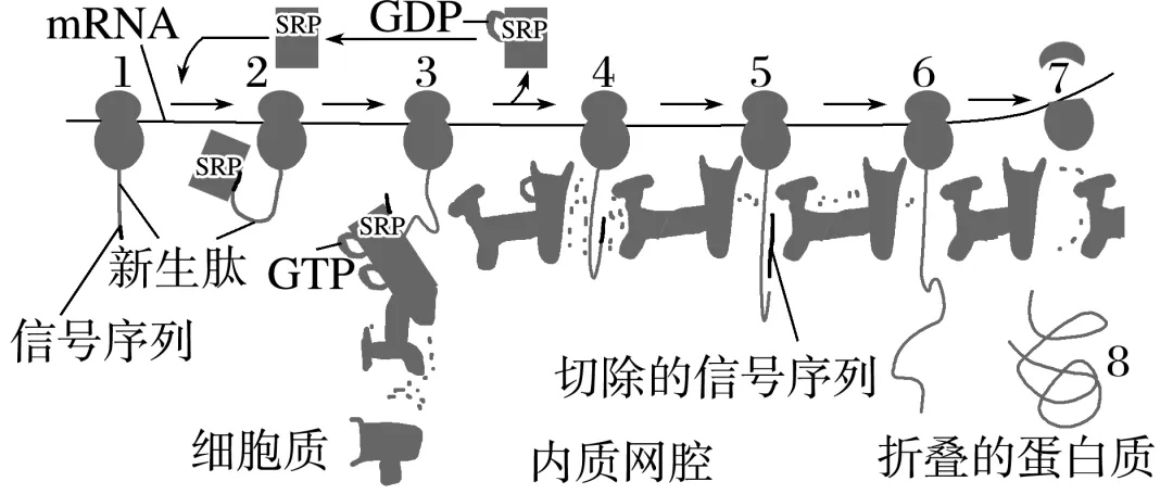 3.(2025·湖北高中名校联盟一模)科学研究表明分泌蛋白向内质网腔内的转运是同蛋白质翻译过程偶联进行的,需要信号肽的引导,具体过程如图,其中SRP是信号识别颗粒,GTP类似于ATP可供能。下列叙述正确的是( )